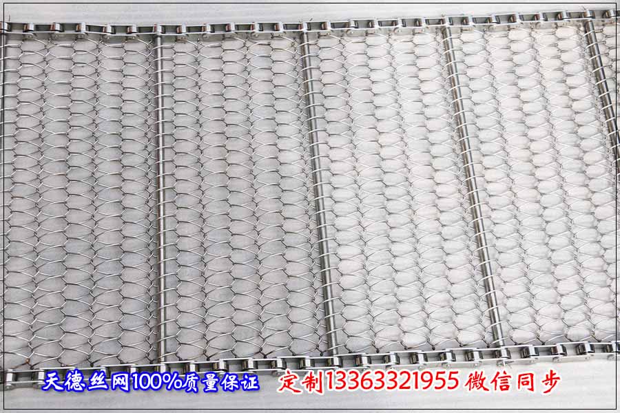 今天上午湖北咸寧客戶來電咨詢鏈條式不銹鋼網(wǎng)帶,用來蒸煮熱干面,干面如同蕨根粉般粗細,在經(jīng)過一番的了解后,定制規(guī)格為: 食品輸送網(wǎng)帶我們采用不銹鋼304材質(zhì),這樣不會影響食品的質(zhì)量,干凈衛(wèi)生,能夠保證面條的原有鮮味。面條輸送網(wǎng)帶采用的結(jié)構(gòu)形式為鏈條式不銹鋼網(wǎng)帶,鏈條網(wǎng)帶總寬為40公分,長為20米,每米輸送網(wǎng)帶上面的載重量在10公斤以下,根據(jù)輸送使用絲徑為1.0毫米,根據(jù)輸送面條的大小不銹鋼網(wǎng)帶的孔定制為5*10毫米,不銹鋼鏈條網(wǎng)帶的節(jié)距為25.4毫米,不銹鋼圓棒支撐桿直徑為6毫米,圓棒之間的間距為150毫米,材質(zhì)選用全部304不銹鋼。