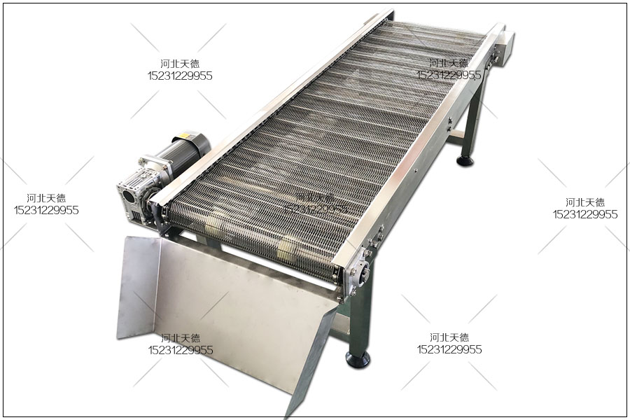輸送帶的材質采用不銹鋼材質,鋼絲采用1.2毫米直徑進行雙旋編織,孔為10*15毫米,鏈條節(jié)距為31.75毫米,鏈桿直徑為6毫米,桿之間的距離為3節(jié)一根。
